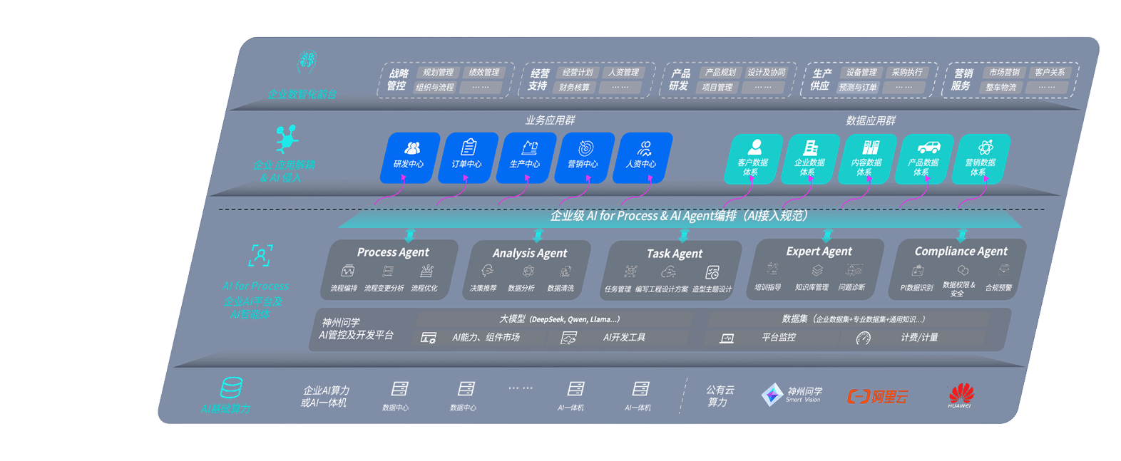 端到端的一站式AI工作空间深度融合了从企业战略规划到日常经营的全流程业务板块,,定向解决车企内部领域多、、、部门多、、链条长、、、、场景碎片化等难题,,支持车企快速构建以AI为核心的生产力写作体系,,,,实现任务执行与AI能力的无缝集成与交互