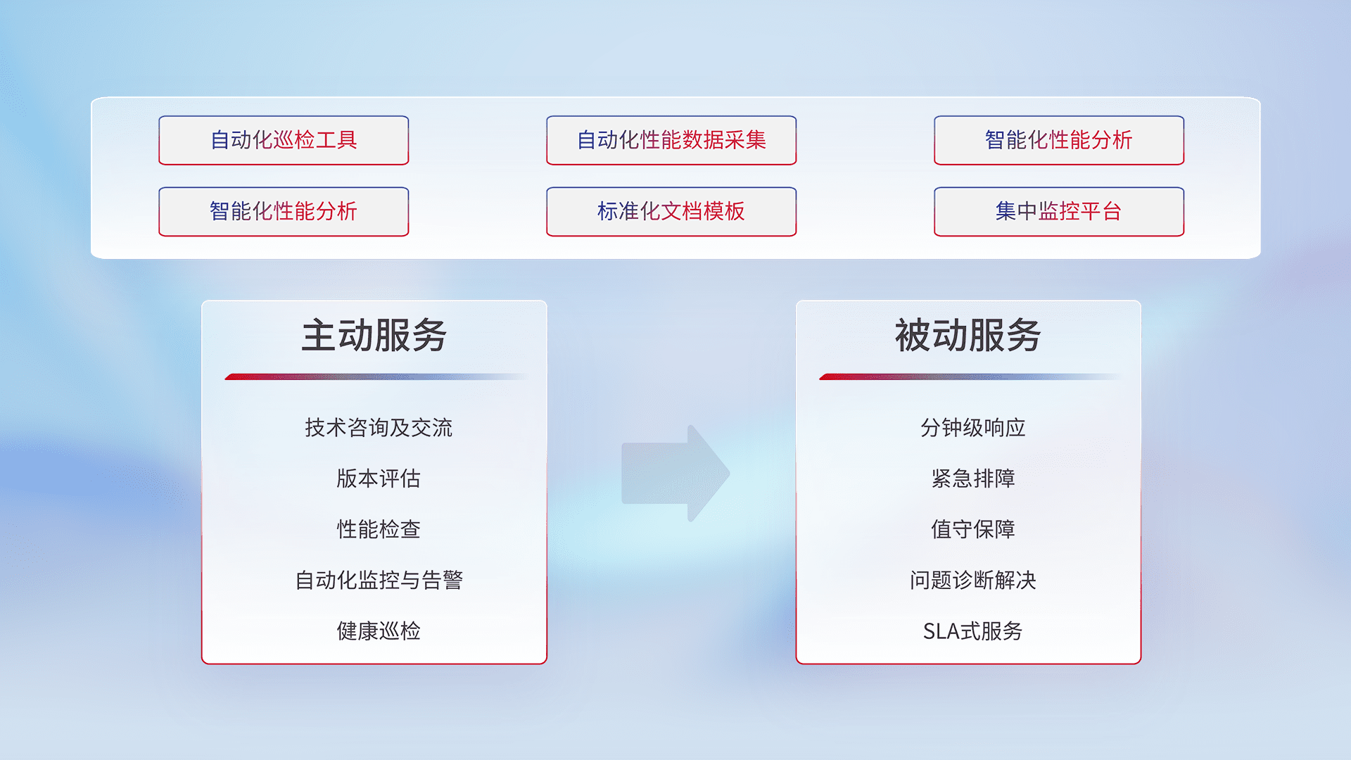 智能化工具和标准化文档,,,保障服务质量,,,,提供主动服务(包含技术咨询、、、、版本评估、、、性能检查、、、、自动化监控与告警、、、、健康巡检)和被动服务包含(分钟级响应、、、、紧急排障、、、、值守保障、、、、问题诊断解决、、、、SLA服务)。。